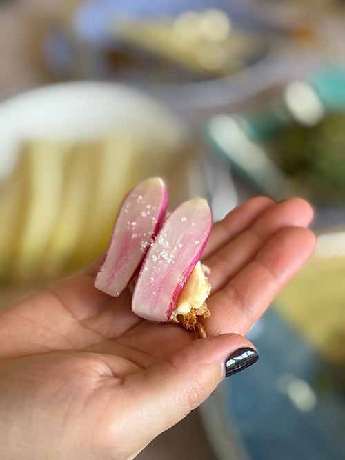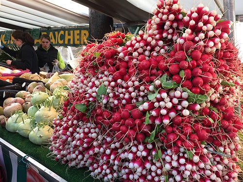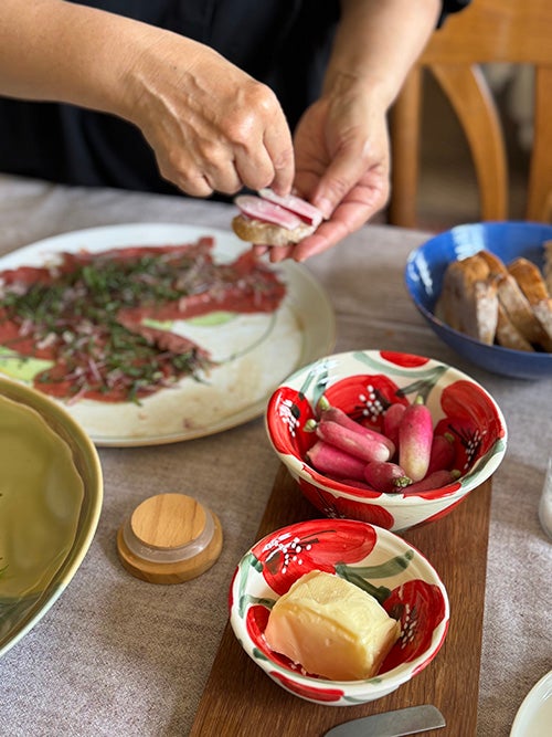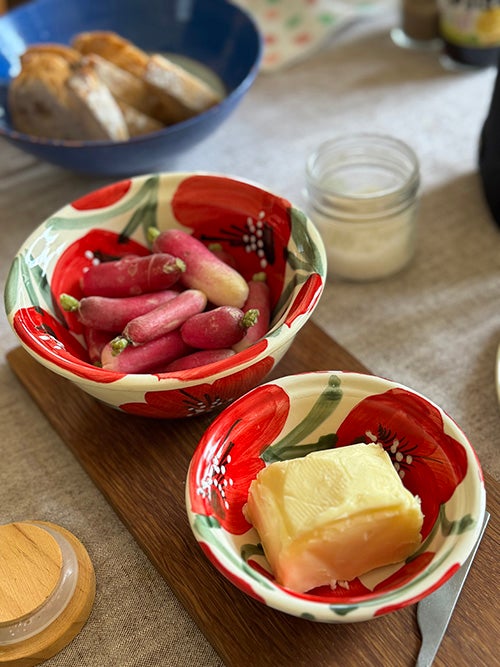 「ラディッシュ」=「かぶ」。 私にとって「かぶ」といえば 絵本の「おおきなかぶ」で登場する、 おじいちゃんもおばあちゃんも 孫もイヌもネコもみんなで 大きなかぶをひっぱる、あの「白いかぶ」。 なのですが、フランスで「かぶ」 プチトマトくらいの大きさの、 赤紫にちょっと白い部分がある 細長いタイプが、最もメジャーなもの。 とはいえそれ以外にも、 ![]() ▲こちらがちょっと大きめ。玉ねぎくらいの大きさの、日本でもいちばん見るタイプのかぶ。 プチトマトくらいの小さなサイズのかぶは、 とにかくポリポリカリカリ、 アペリティフのお酒のつまみなどに、 生のままいただくよ。 フランスの食卓には ものすごく頻繁に登場するラディッシュ。 ちょっぴり辛味もあって、 塩をつけて食べるだけで美味しいのです。 フランスではこのラディッシュに 十字の切り目を入れ、 そこにたっぷりバターを押し入れて、 美味しい塩を振っていただきます。 そう、このとき出てくる 意外すぎるアイテムが 「バター」です。 ![]() ▲前菜のおつまみに頻繁に登場するラディッシュ。 フランスではこんな風におおきなバターの塊と岩塩が一緒になって出てきます。 フランス人の家庭を訪れて アペロ(食前酒)のおつまみに 山盛りのラディッシュが出てくるときも、 レストランのおつまみで ラディッシュを頼んだときも、 おおきな塊バターとともに出てくるんだ。 まりこちゃんも最初は「?!?!」って ![]() ![]() ▲ラディッシュは十字に切り込みを入れ、そこにバターをたっぷり押し込んで塩をつけていただくのが定番。 ですが、お友達の家でおすすめされたのは、バターをたっぷり塗ったバゲットに縦半分に切ったラディッシュをのせて パラパラ岩塩をかけるという食べ方。これもとっても美味しかった♪ ちょっと辛みがあってさっぱりしたラディッシュと、 コクがあって濃厚なバターと、 そしてアクセントになる塩と。 3つの素材のハーモニー。 すぐにでも真似できるこのラディッシュバター、 ぜひみなさんにもやってみてほしい! 意外な組み合わせに 「えっ?!」って思うかもしれないけど、 「百聞は一見にしかず」ならぬ 「百聞は一食にしかず」?! ぜひやってみてね♪ とっておきのバターと塩を使ってね!