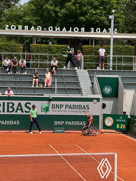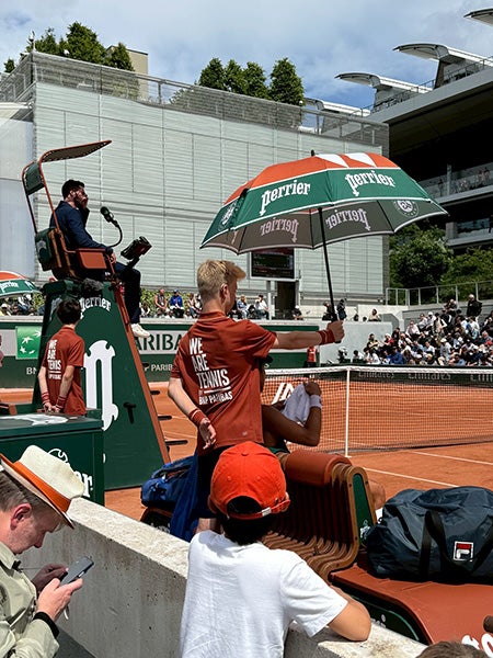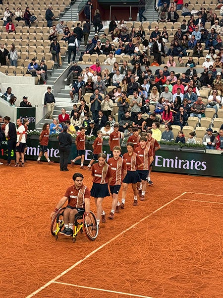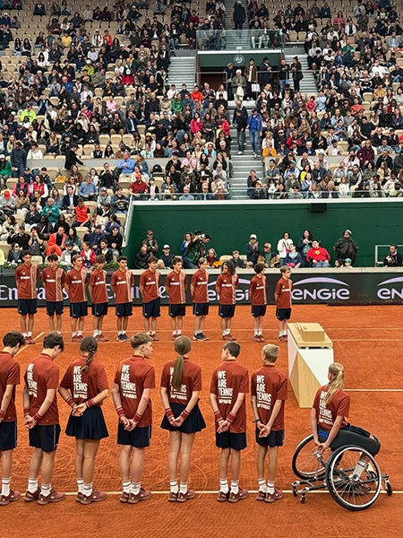 『ローラン・ギャロス』(全仏オープン)の試合で 活躍するボールボーイは、 テニスをやっている子どもたちの憧れ。 毎年全国のテニスクラブに所属している 子どもたちからの応募に対して 厳しいオーディションテストが行われ、 そこで選ばれた子どもたちは ボールボーイとしての技術を学ぶスタージュ (何日間も訓練をするプログラム)に参加。 そこで合格した子どもたちだけが 晴れて『ローラン・ギャロス』の舞台に立てるんだよ。 約300人の子どもたちが 憧れのボールボーイになれるんだけどね、 今年は史上初めて2人の 車椅子のボールボーイが選ばれたんだって!