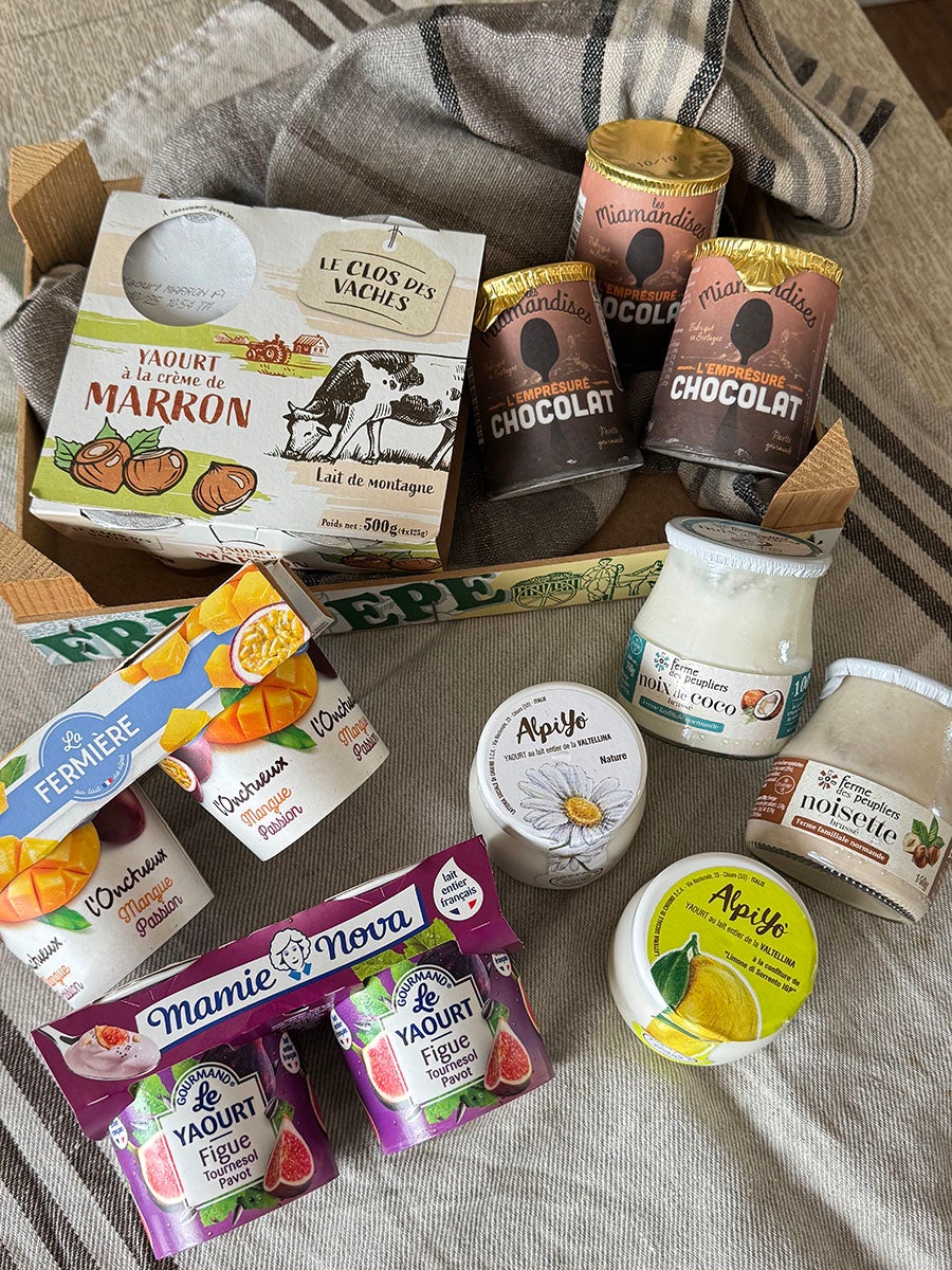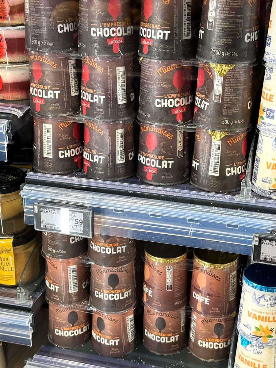フランスのスーパーのヨーグルト売り場の ヨーグルト、ゼリー、杏仁豆腐、プリンetc. そしてヨーグルトの部分が濃厚で、